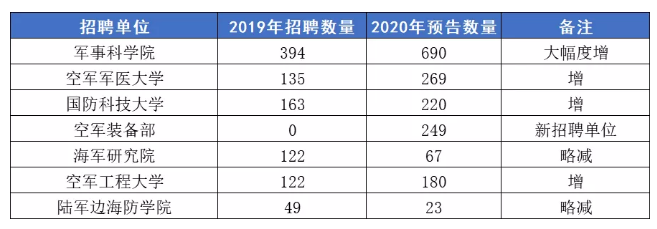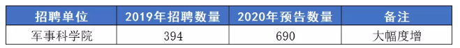 以軍事科學(xué)院為例:2019年招錄文職人員數(shù)據(jù)與2020年文職人員招錄計(jì)劃數(shù)據(jù)對比分析如下:
